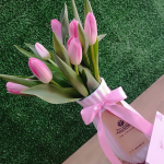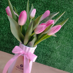 Contiene 10 Tulipanes color a elegir: rosado bebé, fucsia, morado, blanco y rojo. *No incluye color Azul en Florero Importado con lazo de cinta satinada. Incluye de Obsequio Dedicatoria Computarizada y Globito